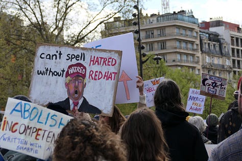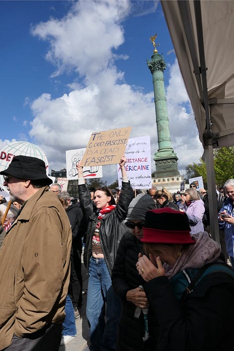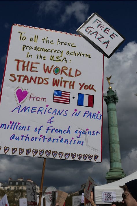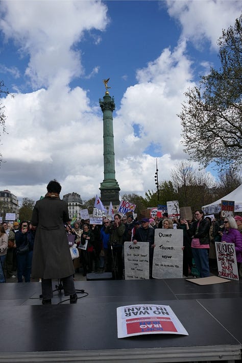 🌍 TRANSLATOR’S NOTE: The No Kings protests are receiving coverage in international press as something more than American domestic politics — they are being read as a referendum, conducted in the streets, on a war the American public was not asked about. European outlets are noting that the protests are growing larger with each iteration, and that the Iran war has added an explicitly foreign policy dimension to what began primarily as a domestic grievance movement. The image of millions of Americans marching against their own government’s war, on the war’s one-month anniversary, is being broadcast across the Arab world, Europe, and Asia. For populations whose governments have been unable to stop or even formally oppose the war through diplomatic channels, the American street is being watched as the remaining avenue of accountability. In Paris today, the people who came were not performing solidarity. They were registering a verdict.